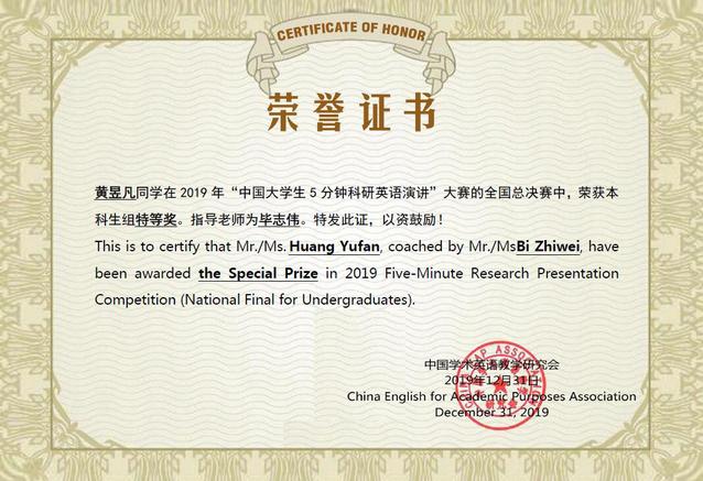 我校大学英语竞赛团队从去年6月开始积极备赛,在全校范围内遴选人才,组建参赛队伍。beat365官网公共英语教研中心张乐副教授和毕志伟副教授从学术写作、演讲语言、仪态、视频制作等各方面精心指导。最终,来自管理学院18级学生黄昱凡和陈昊澜分别荣获本科生组全国特等奖和一等奖,另有两名同学获得二等奖。张乐老师和毕志伟老师荣获“优秀指导教师”奖。