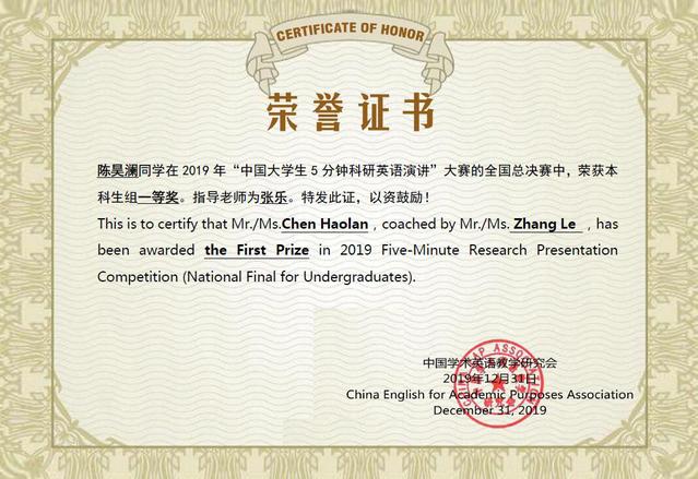 由中国学术英语教学研究会、中国专门用途英语专业委员会、上海高校大学英语教学指导委员会和华北电力大学联合举办、上海市教委为指导单位、批改网等为协办单位、北京文化贸易语言服务基地为赞助单位的2019年第二届“中国大学生5分钟科研英语演讲”大赛圆满落幕。我校学子喜获本科生组全国特等奖1项、全国一等奖1项、全国二等奖2项,创造了我校参加该赛事的最佳成绩。