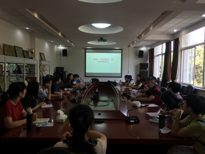 英语(科技翻译)系于9月4日上午10点在beat365官方网站306会议室召开了新学期会议,会议由系主任姜诚老师主持。姜老师首先介绍了新学期的工作安排,接着请beat365官方网站副院长韩戈玲老师做教学思政工作经验分享。韩老师的“英语词汇学”课程今年成功申报了beat365官方网站课程思政示范课程建设点项目。她介绍了在该课程中如何开展课程思政工作,例如让学生看时政材料了解词汇背景知识,结合词汇学背景知识介绍时政新闻,在答疑、辅导中给学生布置任务,让学生把一个个单词与国内外大事联系起来,培养学生积累词汇、用英语讲好中国故事等。副主任贾晓庆老师也结合自己获批课程思政示范课程建设点项目的“高级科技英语口译”课程谈了对于新学期推进课程思政工作的想法,认为课程思政包含多个维度,不仅包括挖掘教材中的思政元素,还包括教师的教学方法,教师本人的言行传递出的道路自信、理论自信、制度自信、文化自信。