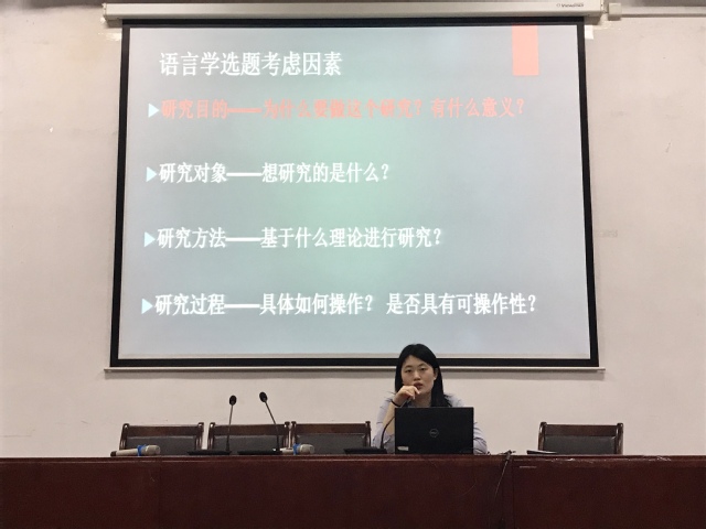 唐骋老师结合具体选题案例,介绍了语言学选题要考虑的研究目的、研究对象、研究方法和研究过程四个方面,选题要经历的理论梳理、文献梳理和语料选取三大步骤。唐老师强调,语言学理论非常丰富,选题时要做到理论概念清晰,切入点具体,有个人创新和大局意识。此外,唐老师向同学们介绍了国内外常用且能方便获取的文献数据库及各自特点。