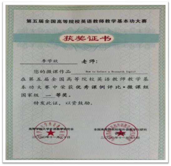 由高等学校大学外语教学研究会和全国高等师范院校外语教学与研究协作组共同主办的第五届全国高等院校英语教师教学基本功大赛评选工作圆满落幕。beat365官网公共英语教研中心教师李学欣的微课作品“How to Select a Research Topic?”从竞争激烈的众多参赛作品中脱颖而出,最终斩获2020年度优秀课例评比·微课组“国家级一等奖”。