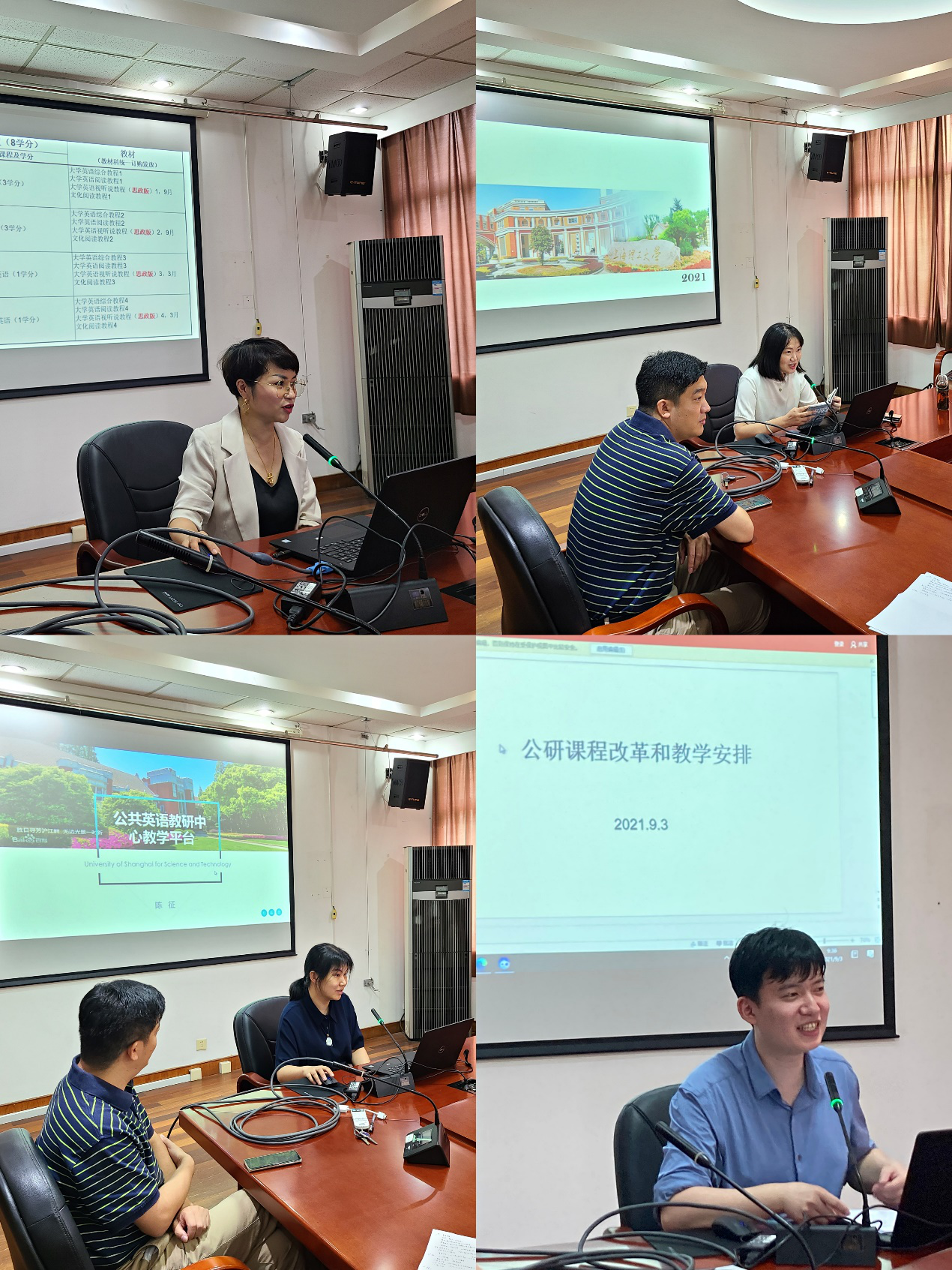 本次会议由公共英语教研中心主任、课程思政领航团队负责人张乐副教授主持。首先,马芫副主任对本科课程设置及教材调整作了详细说明,着重梳理了各门课程及教材中的思政内容,提醒任课老师在课堂教学、课后作业等环节有机融入思政元素,进一步推动部门的课程思政建设。随后,柏钧副主任对新学期分级考试的调整及考务工作作了详细的说明。接着,陈征副主任向各位老师介绍了新学期将使用的四大在线学习平台,明确平台学习在“阶段性、动态性、全程性”评价中发挥的重要作用,并重点介绍了各平台上可使用的丰富思政教学资源。随后,缪蓬副主任介绍了研究生公共英语课程改革的情况,以及新学期的授课安排。最后,张乐主任对本次会议进行总结,动员全体老师为新学期继续开展的“1+1+1”课程思政系列活动做好充分准备,并强调要将思政元素有机融入到教学的全过程。