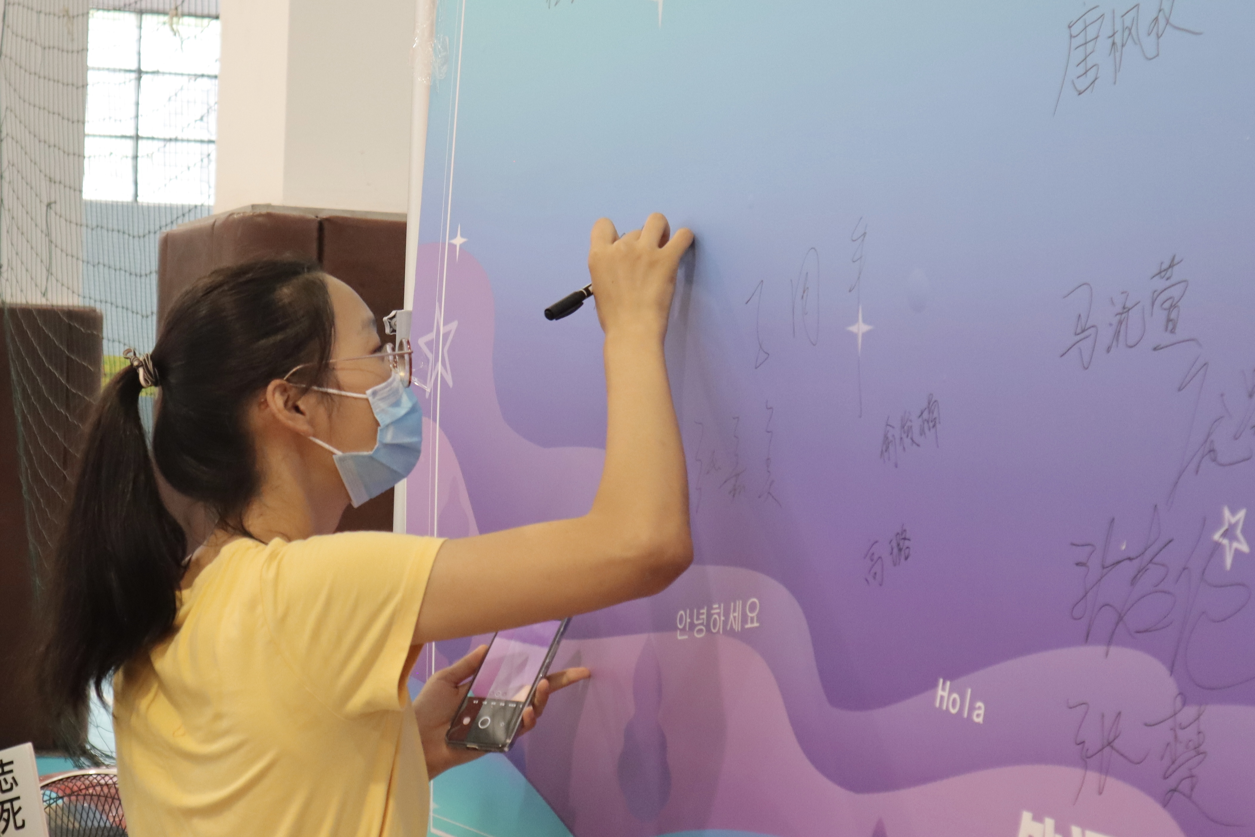 在新生报到的主要地点——新体育馆,学院设置有专门的引导摊位,现场设有签名板、合照板、小外表情包手牌和对学院、专业以及团委、学生会介绍的易拉宝,旨在让同学们更加了解beat365官方网站并快速的融入beat365官方网站这个温馨快乐的大家庭。也有专门的志愿者负责提醒新生填写表格、收集新生的基本信息,并引导新生完成报到流程。此外,新生们还会在志愿者们的帮助下,将自己的名字写于学院放置的签名版上,姓名与外院交会,这是一份真正将自我印刻在新生活上的仪式。