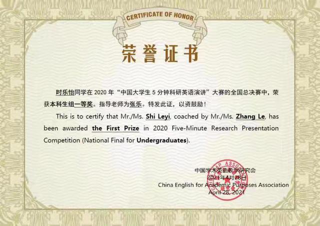 由中国学术英语教学研究会、中国专门用途英语专业委员会、上海高校大学英语教学指导委员会和华北电力大学联合举办、上海市教委为指导单位、批改网等为协办单位的第三届“中国大学生5分钟科研英语演讲”大赛圆满落幕!我校学子喜获本科生组全国一等奖1项、全国二等奖2项、全国三等奖1项,连续三届在该赛事上获得全国一等奖及以上成绩。