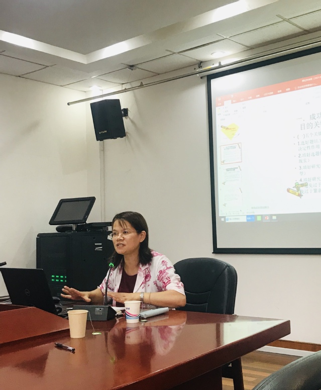 最后发言的是俞曦霞教授,她提出国家社科项目申报的五个关键环节和三个要素,从宏观和微观两方面进行了让人耳目一新的总结和归纳。她还对2019-2021年外国文学学科成功立项的课题进行了综览,从学术资源数据库的利用、关键词和热点领域的选择等具体方面进行手把手的指导。俞教授鼓励大家善于找寻“热点中的冷点”,发掘“专精特新”课题,她的全情投入、循循善诱和倾囊相授,让在场的老师们都感觉受益匪浅。