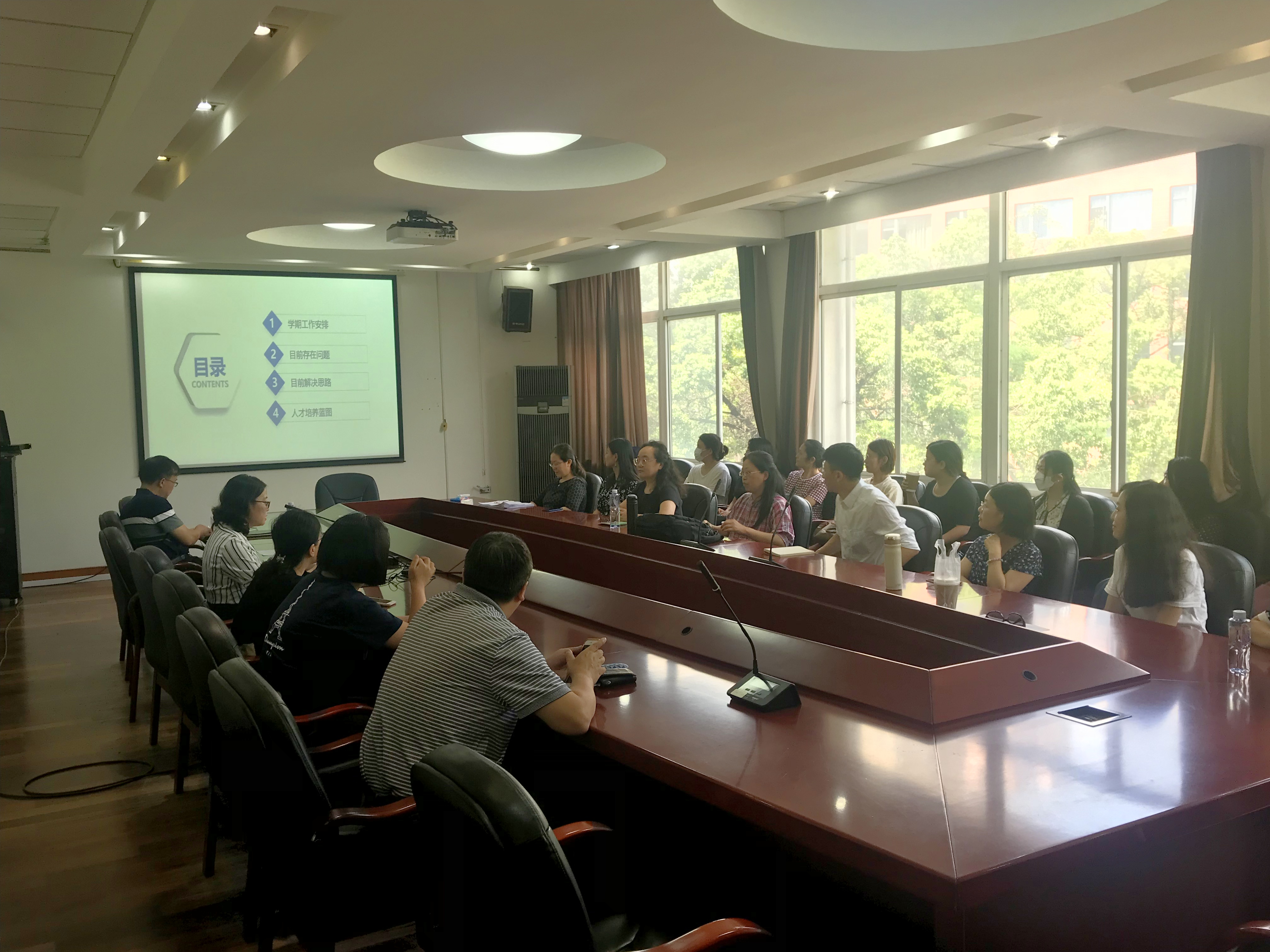 会议上,黄芳主任分四个版块对本学期各项工作做了详细布署并对与会教师提出具体工作要求。在“学期工作安排”版块中,黄老师针对教学、教研、学生赛事、教师赛事以及毕业论文指导等项细分工作做了全面任务描述和人员分配,尤其对毕业论文指导教师直接参与毕业班学生的就业促进方面提出明确要求。在“目前存在的问题”版块中,黄老师剖析了本专业各年级学生面临的问题,并在“解决思路”环节,要求全系教师主动了解、关心学生,引导他们明确专业定位,并在“新型班主任”和“学士导师”制度下,进一步提升高校教师应有的责任意识,以促进学生健康成长为己任,扎实推进新生入学后的积极引导、毕业班学生顺利就业等各项关键工作。黄老师最后强调,为实现我系人才培养的蓝图,系部全体教师应坚持“点对点”的工作模式,以全方位考量学生的发展需求为前提,切实推进高效师生互动机制的建立与维护,从细节上保证专业人才培养目标的高水平实现。