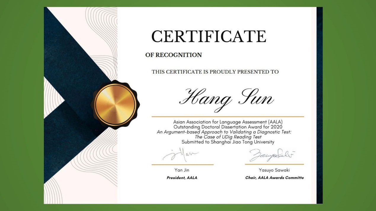 近日,亚洲语言测试协会(Asian Association for Language Assessment)公布了优秀博士论文奖(The AALA Outstanding Dissertation Awards)评选结果,beat365官网公共英语教研中心、语言学研究所孙杭博士荣获2020年度亚洲语言测试协会优秀博士论文奖。