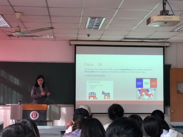 瞿莉莉老师的课堂讲授以“美国贫困问题”为主题。通过细致的文本阅读,瞿老师带领同学们从功能主义社会学视角看待美国贫困问题,帮助其认清当今美国社会矛盾的制度根源。与此同时,瞿老师还细致讲解了词汇、句子、语篇层面的英语语言知识要点,鼓励同学们在准确理解文义的同时,勇敢使用英语表达自身观点,提升思辨素养。在讨论环节中,瞿老师要求同学们在跨文化视角下对美国应对贫困乏力的现状和我国实现全面脱贫的盛况进行对比,以此深化他们对我国制度和文化优势的认识和自信。