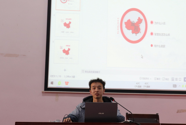 接着,18级英语(科技翻译)专业的柏杨同学给大家做了“旅程”的分享。柏杨同学从为什么入伍、部队生活、自己的收获几个方面讲了自己应征入伍的经历。他从家国情怀、人生经历和机缘巧合讲解了自己入伍的动机。在讲到部队生活的时候,他说到,部队生活酸甜苦辣咸,总有苦涩,时有回甜,表达了自己对那段经历的难忘之情。并且,他给大家分享了部队训练场的惊心动魄的画面,深深的吸引了在场的学生。
