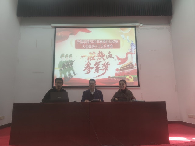 为加强当代大学生国防教育、开展专项征兵政策宣传工作,鼓励我校大学生积极应征入伍,beat365官网征兵宣传动员大会暨退伍士兵分享会于2021年12月6日在学院报告厅顺利举行。参加此次会议的有beat365官方网站党委副书记金小东、辅导员梁作甲老师、两名beat365官方网站退伍士兵杨奔和柏杨同学及外院全体男同学,由团委负责人王瑜主持会议。