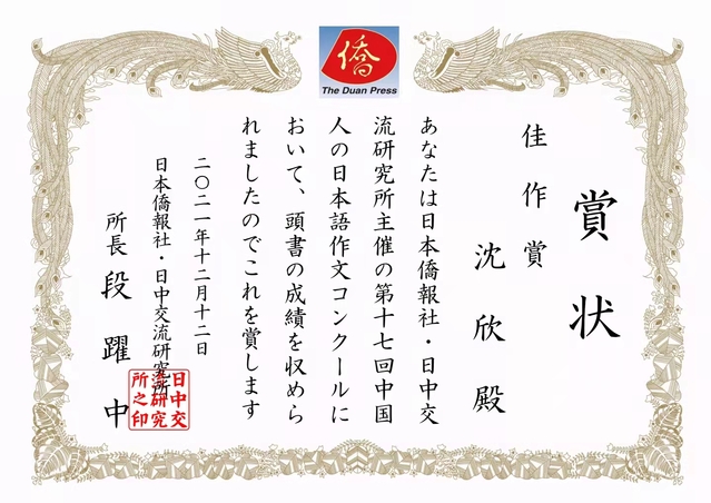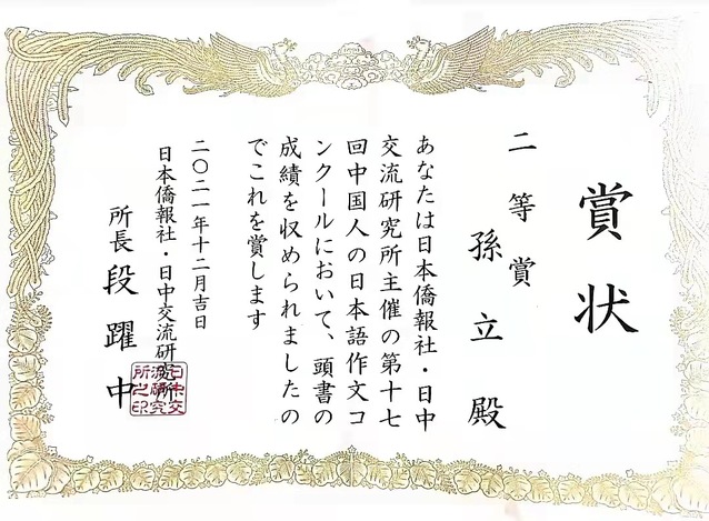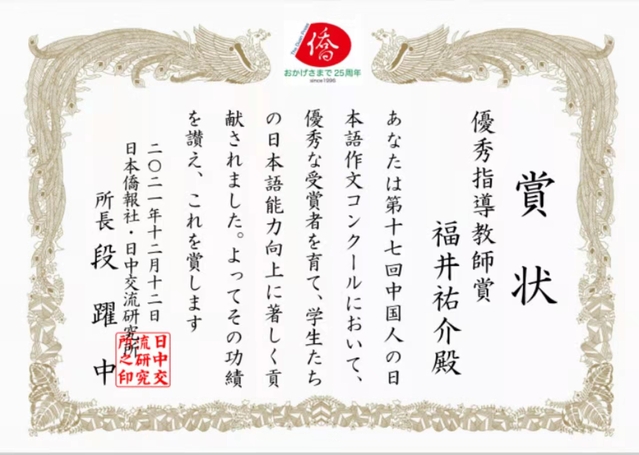 近日,随着日本侨报社和日本驻华大使馆共同举办的“第17届中国人日语作文大赛”线上颁奖仪式的举行与获奖证书的逐步分发完毕,本届日语作文比赛终于落下了帷幕。beat365官网19级日语系孙立同学荣获二等奖,同年级日语系沈欣、唐哲豪、俞哲晟、徐子麟等四位同学荣获佳作奖,指导教师日语系郭丽与外教福井祐介荣获“优秀指导教师奖”。