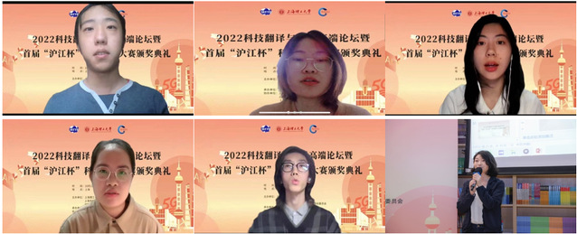 来自新疆大学、西安外国语大学、江苏理工学院、南京信息工程大学、上海大学和我校的六位一等奖获奖学生发表感言。俞璐同学表示,与其他翻译比赛不同,“沪江杯”科技翻译大赛提供的原文文本科技含量更高、学术性更强,涉及到大量的专业术语、模型及算法,需要参赛选手参考相关文献和资料才能确定最终译文,具有极大的挑战性。她在翻译科技文本的同时也学习了科技文化,提升了科技传播能力和素养。