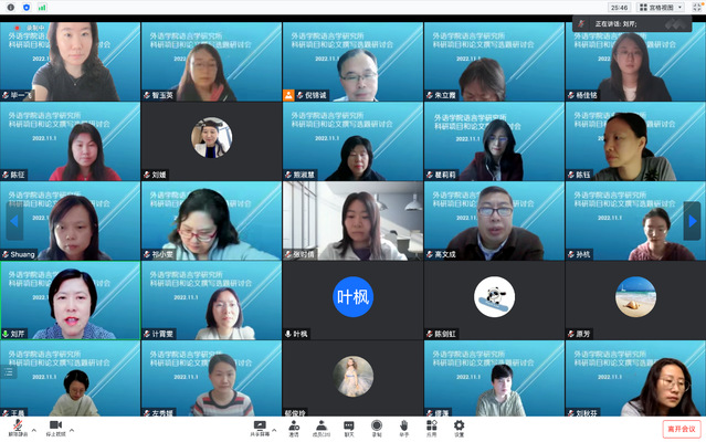 11月1日下午,beat365官方网站语言学研究所召开科研项目和论文撰写选题研讨会。研讨会邀请了本所3位教师对文科三大项做选题分析和申报建议,另有12名教师分享了自己拟申报项目或撰写论文选题,研究所教师参与了点评和/或讨论。本次研讨会旨在提高语言所教师科研项目申报和学术论文撰写质量,以促进明年科研项目申报和高水平论文发表成功率。研讨会先后由语言学研究所所长倪锦诚教授和副所长瞿莉莉副教授主持。