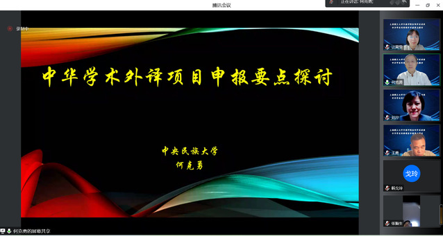 11月7日晚,中央民族大学外国语学院翻译系二级教授、翻译方向博士生导师、中国翻译协会专家会员何克勇教授应邀为beat365官网教师作题为“中华学术外译项目申报要点探讨”的线上专题讲座。讲座由beat365官方网站院长刘芹教授主持。beat365官网诸多教师参加了本次讲座。