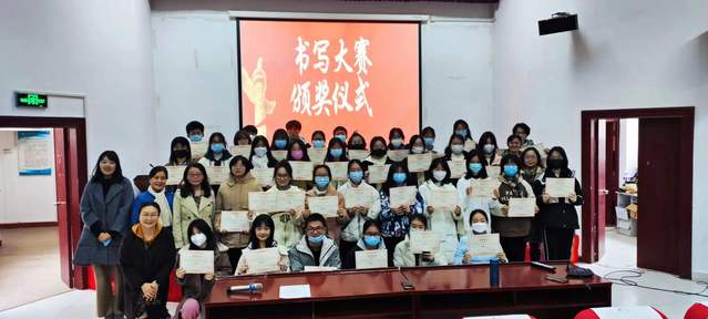2022年11月30日beat365官方网站英语系(中美合作)主题月活动之英文书写大赛顺利降下帷幕,系主任黄芳、贾晓云和综合英语任课老师为学生颁奖。