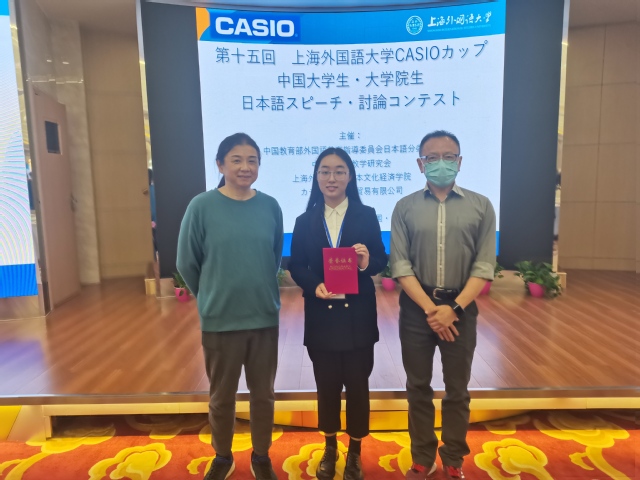 2023年5月20日,由上海外国语大学日本文化经济学院、教育部高校外语专业教学指导委员会日语分委员会、中国日语教学研究会、卡西欧(中国)贸易有限公司联合主办的第十五届上海外国语大学“卡西欧杯”中国日语专业本科生•研究生演讲辩论大赛决赛在上海外国语大学虹口校区成功举行。来自厦门大学、北京大学、上海外国语大学、南京大学、中山大学等国内知名23所高校的24名选手同台竞技、展现出各自出色的日语表达能力和思辨能力。我校本科2020级日语专业郭珂妤同学通过初赛选拔成功进入决赛,在决赛激烈的角逐中获得优胜奖。日语系江春华老师、福井祐介老师在比赛前期进行了精心的指导,获得“优秀指导教师奖”。
