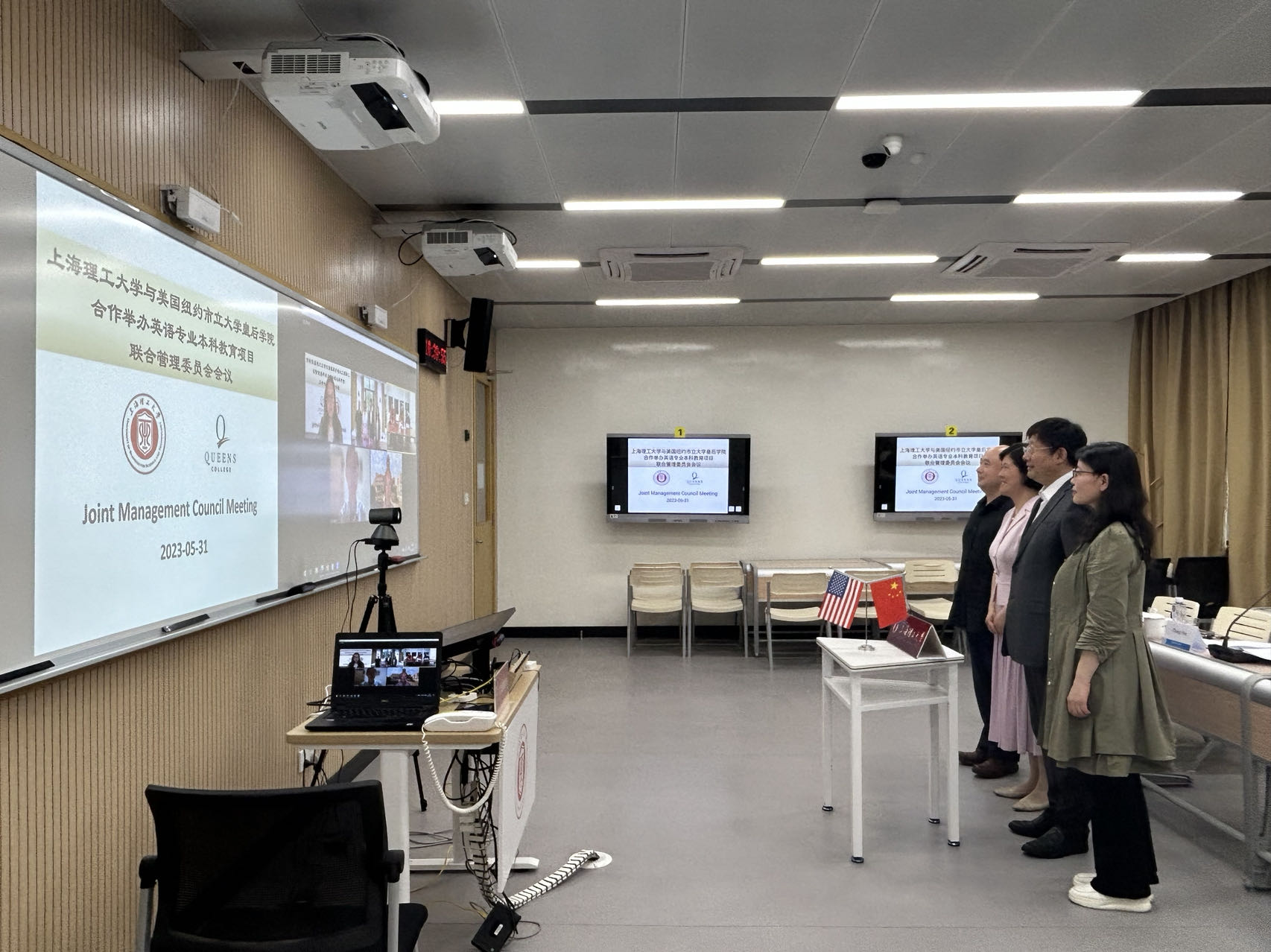 5月31日上午,beat365官方网站中外合作办学项目—beat365官方网站与美国纽约市立大学皇后学院合作举办的英语专业本科教育项目联合管理委员会会议在学校智慧教室召开。此次管委会会议采取线上视频会议的方式。校长丁晓东发来致辞,副校长张华主持会议,美国纽约市立大学皇后学院校长Frank H. Wu、副校长兼代理教务长Patricia Price、艺术与人文学院院长William McClure、国际交流办公室执行主任Patrick O’Connell、项目外方负责人Tao Wang,beat365官方网站院长刘芹,国际交流处和beat365官方网站相关负责人参加会议。