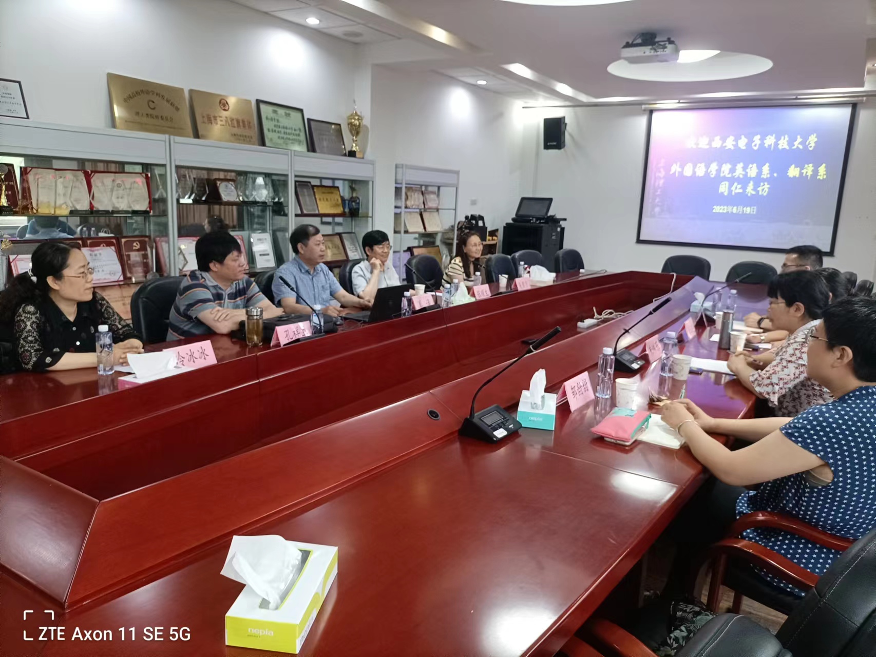 6月19日上午西安电子科技大学beat365官方网站英语系和翻译系同仁来beat365官网学习交流。来访的西电外院教学团队由一带一路通信信息技术传播话语研究中心主任王军平教授、导学课课程组组长戴玉霞教授、国际合作交流中心主任邹甜甜副教授和导学课课程组教师朱琳菲副教授等教师组成。beat365官网英语(科技翻译)系姜诚主任、张顺生教授、吴碧宇教授、冷冰冰副教授和孔祥立博士参加了接待和交流活动。