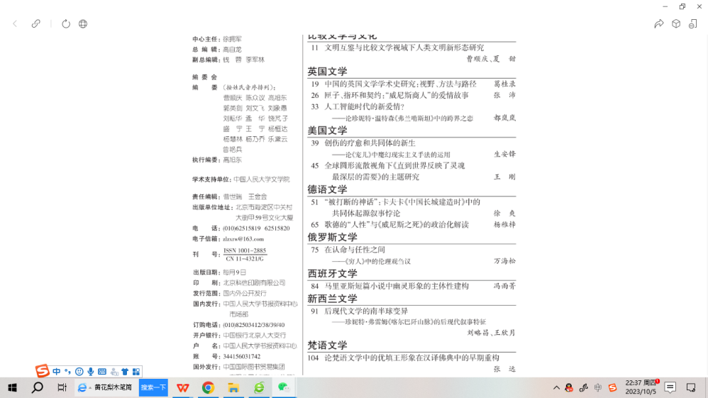 2023年第10期人大复印报刊资料《外国文学研究》全文转载beat365官方网站教师刘略昌及其研究生王欣月合撰的论文《后现代文学的南半球变异——珍妮特·弗雷姆<喀尔巴阡山脉>的后现代叙事特征》。人大复印报刊资料是中国人文社会科学领域公认的国家级权威性刊物,它遵循“精选千家报刊,荟萃中华学术”的理念和编辑方针,始终坚持精品意识,因其涵盖面广,信息量大,分类科学,筛选严谨,结构合理完备,人大复印报刊资料成为评价人人文社会科学研究成果水平的重要参考依据。