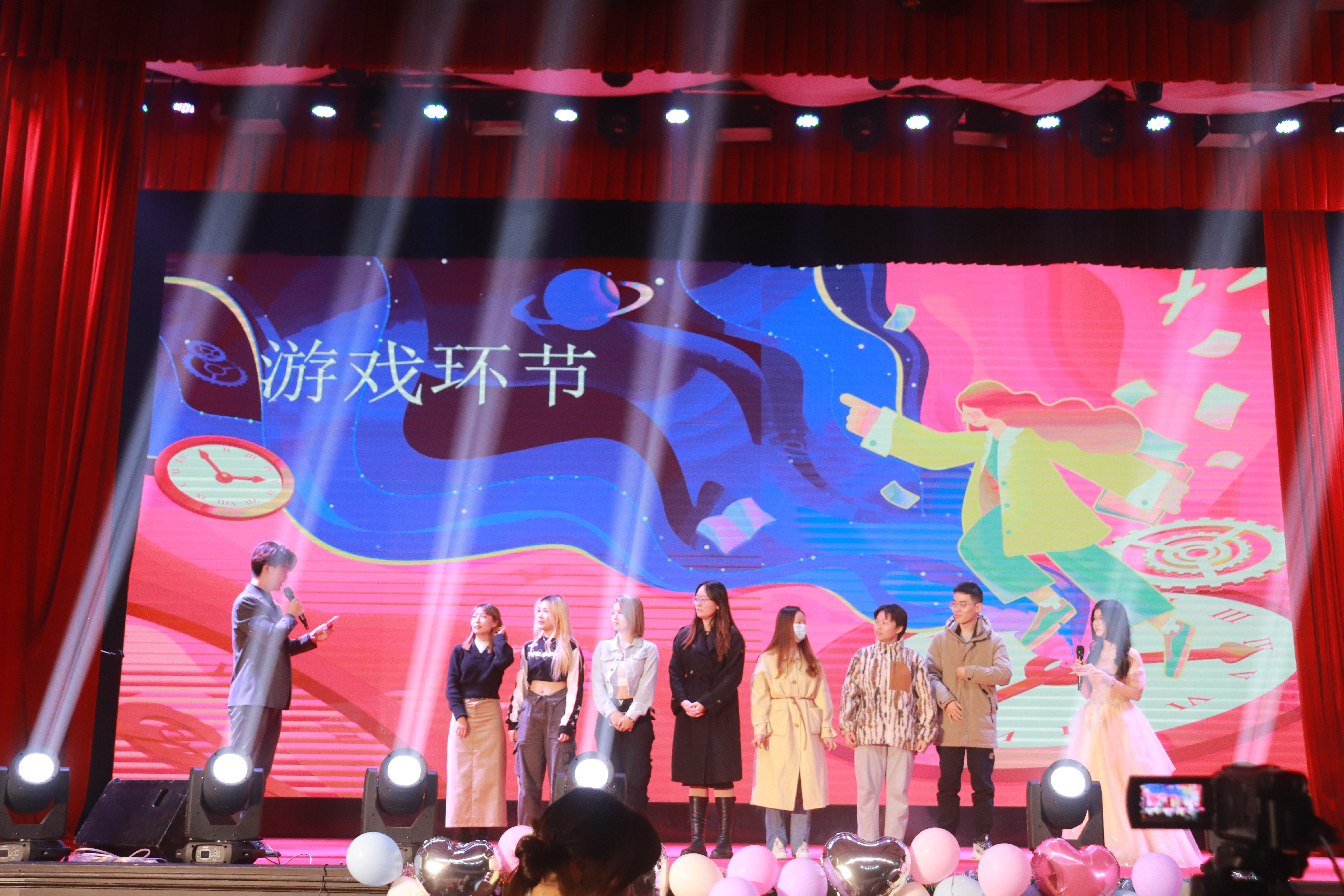 不仅有丰富多样的精彩表演,节目间隙引人入胜的游戏环节也为整个晚会增色不少。像是“K歌之王”、“逛三园”、“抢凳子”等规则简单却趣味恒生的游戏不仅激发了现场观众的热情,还为同学们提供了互动参与的机会,同学们快乐的神情也为整个晚会注入了更多喜悦的色彩。