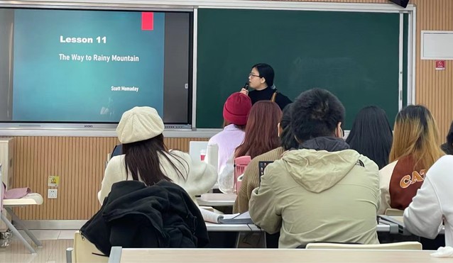45分钟的课堂中,赵美欧老师以D.H.劳伦斯的“spirit of place为切入点,开启了课文“The way to Rainy Mountain的讲解。她通过图文并茂的方式,在文章讲解中引入丰富的美国地理环境、印第安基奥瓦人的历史等背景知识,引导学生梳理文章脉络,使学生更好地理解原文情感和表达语境。赵老师接着分析原文的关键语句及修辞手法,以文章中“green belt一词引出李白、韩愈、柳宗元所作的经典诗句,又从“in death her face was that of a child引申到《道德经》的“常德不离,复归于婴儿”一句,将中美两种文化有机地进行融合讲解,通过对比分析,使学生更加深入地理解了中国历史的源远流长和中国文化的博大精深。赵老师非常巧妙地借用案例将文化与文字融合起来进行讲解完美地展现课程思政建设中如何将中传统文化融入英语教学