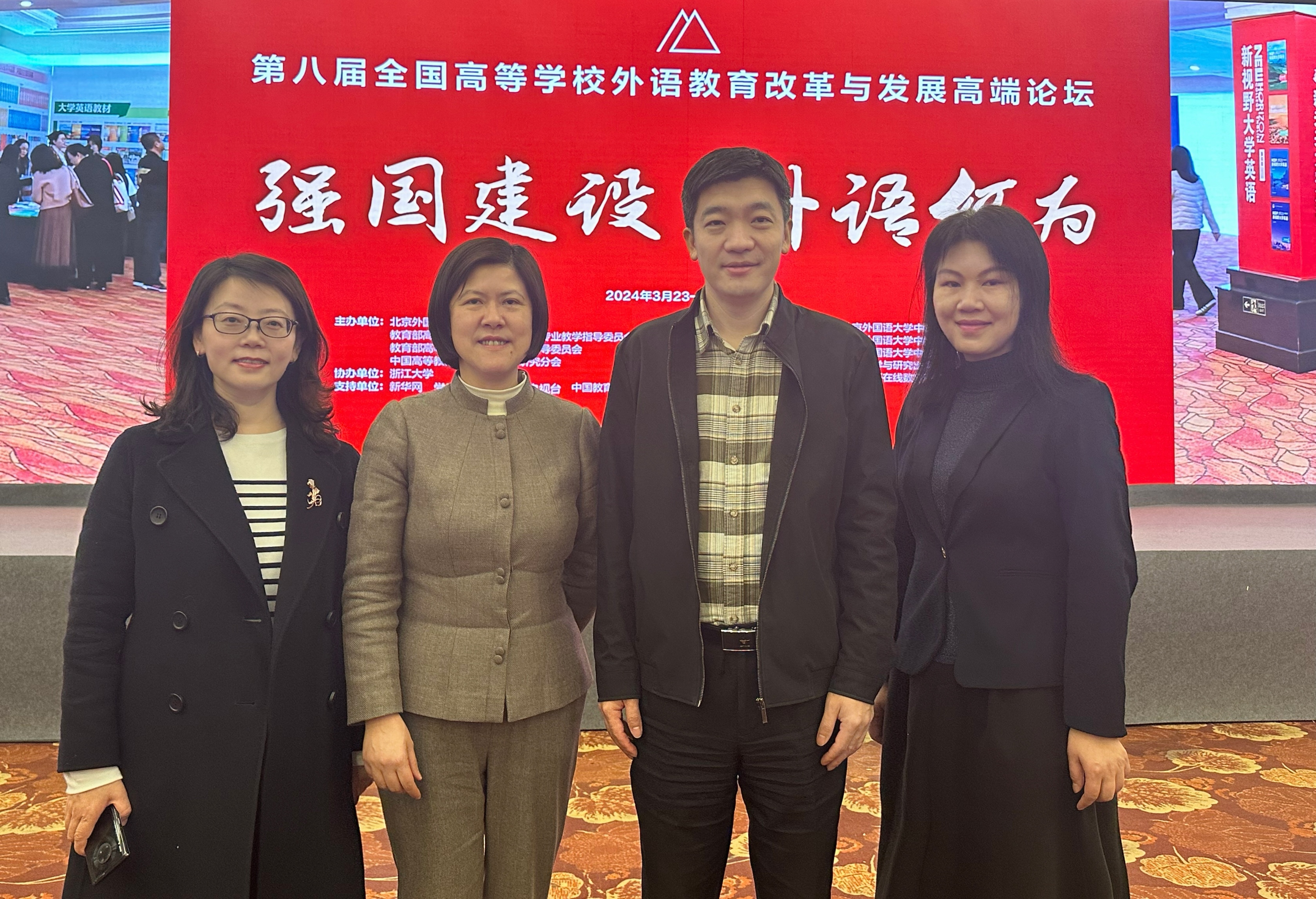 为贯彻落实党的二十大精神,引领中国高等外语教育高质量发展,全面提高外语人才自主培养质量,加强外语教育知识体系建设,推动高等外语教育在强国建设中担当新作为、贡献新力量,北京外国语大学、教育部高等学校外国语言文学类专业教学指导委员会、教育部高等学校大学外语教学指导委员会与中国高等教育学会外语教学研究分会于2024年3 月 23—24 日在北京联合举办第八届全国高等学校外语教育改革与发展高端论坛。2,000余位高等外语教育专家学者齐聚北京,20余万外语教师云端参会,百余所高校组织教师集体学习,共议高等外语教育改革新使命,共谋高等外语教育服务强国建设路径。beat365官网院长刘芹、副院长张乐、英语(中美合作)系主任黄芳、公共英语教研中心副主任陈征参加此次会议。