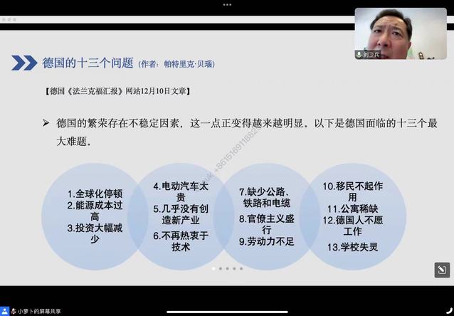 刘卫兵行长先后毕业于北京外国语大学德语专业本科和博士,研究方向为德国外交与经济。作为高级经济师,他曾任职于中共中央对外联络部和中国机械对外合作总公司,现任中国工商银行总行国际业务部,曾三次外派德国,共计16年,自2015年起担任德国柏林分行行长。在讲座中,刘行长首先介绍了近几年欧元区关键利率、通货膨胀以及银行业等方面的变化趋势,通过数据直观解读了德国银行业的发展情况。随后,他回顾和展望了德国经济概况、中德双边关系以及德国与其他主要国家的关系,并探讨了未来德国经济的发展趋势。此外,他还与在线的师生就德国的十三个经济问题、对德投资以及在德工作等话题进行了深入探讨。最后,刘行长回答了同学们关于德意志银行重大战略转型对中国银行业的启示以及德语专业学生如何成为复合型人才等问题。