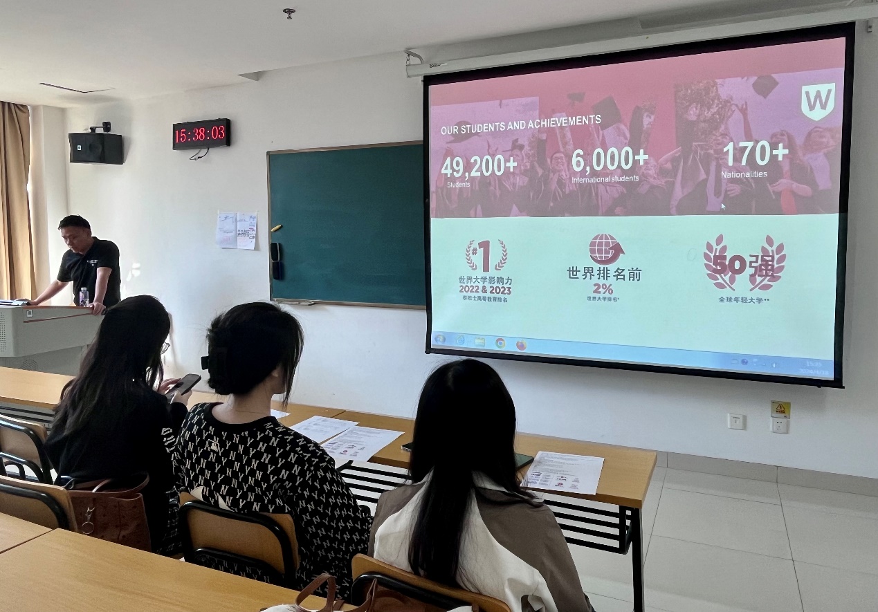 4月18日下午,澳大利亚西悉尼大学(Western Sydney University)国际招生办公室主任张业钒老师莅临我校,开展本硕连读项目和硕士联合培养项目的宣讲活动,向同学们介绍了该校的优质教育资源以及出国学习的机会。