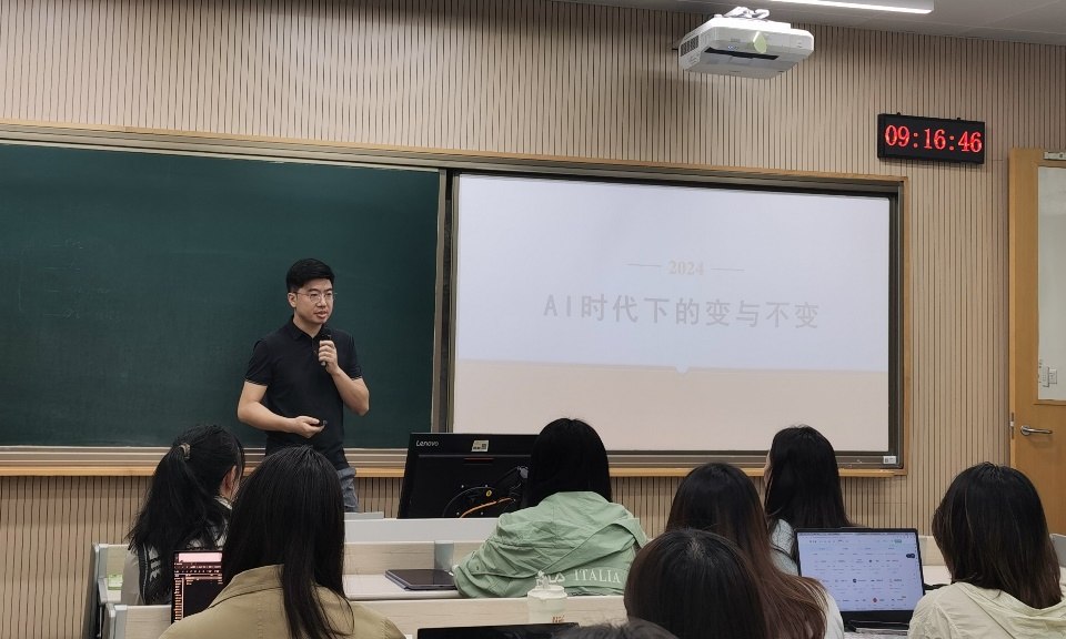 10月19日上午,浙江省电魂AI创新研究院执行院长、蓝鸽集团科研院首席专家王琦为我校“语言智能”微专业学生作专题讲座,主题为“AI时代下的变与不变”,微专业全体学生参加,beat365官方网站韩洋博士主持讲座。王琦院长以其在浙江大学、香港科技大学、香港理工大学的教育背景,基于数智校园湘湖未来学校核心创校成员的深度创校经验以及丰富的教育数字化与智能化业务管理经验,从技术和行业内部视角向同学们深度解析了AI时代下的变与不变。