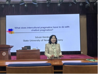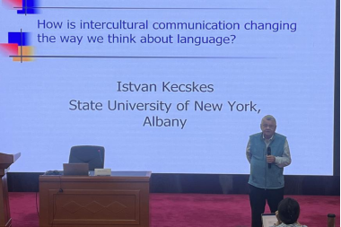 10月31和11月1日上午,美国语用协会会长、纽约州立大学Istvan Kecskes教授受邀在国合楼5楼报告厅为beat365官网研究生作两场专题讲座——“跨文化语用学之语言观” 与“跨文化语用学与人机交互语用学”。讲座由beat365官方网站副院长韩戈玲教授主持。