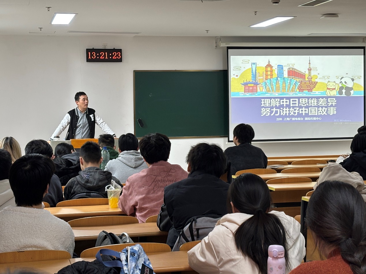 11月26日下午,上海广播电视台高级记者、全国唯一日语电视节目《中日新视界》负责人沈林老师应邀为beat365官方网站日语系师生带来一场题为“理解中日思维差异,努力讲好中国故事”的精彩讲座。讲座由日语系主任杨本明教授主持,日语系外事负责人王俊红博士、董瑜老师及日语系本科生、研究生60余人参加了讲座。