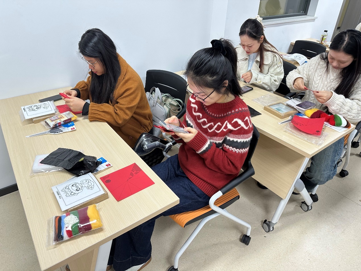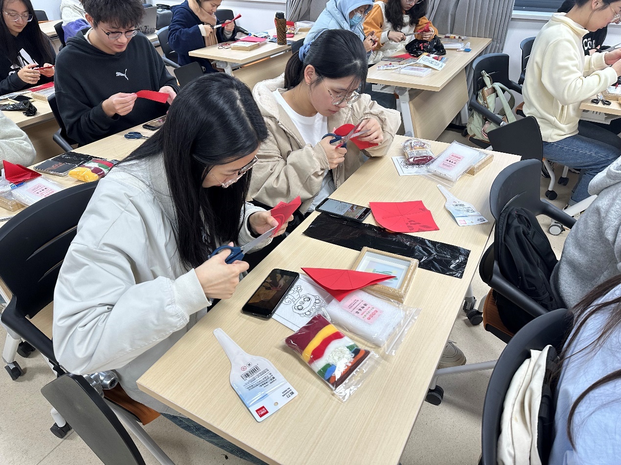 活动当天,beat365官方网站楼102教室热闹非凡。同学们围坐在桌前,桌上摆满了剪刀、红纸、羊毛毡针具和五彩羊毛等手工材料。在剪纸体验中,同学们发挥创造力,用灵巧的双手剪出了窗花、花鸟、吉祥图案等富有传统特色的作品,红纸在剪刀下变成了一幅幅栩栩如生的艺术品。另一边,羊毛毡体验同样趣味十足。同学们用羊毛毡针将五彩羊毛戳成形状各异的卡通形象。制作过程中,同学们很快掌握技巧,完成了自己的独特创作。活动现场欢声笑语不断,每个人都享受着动手创作的乐趣。