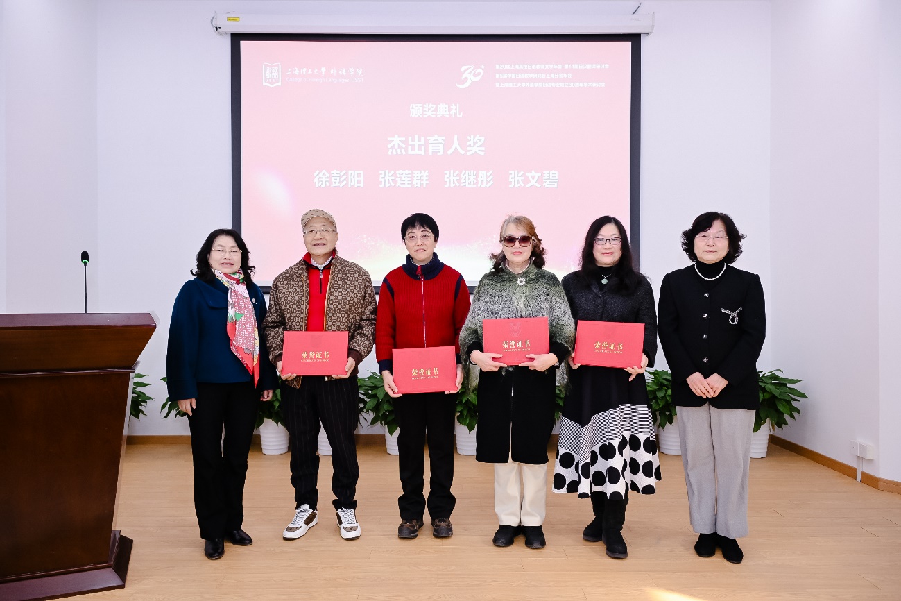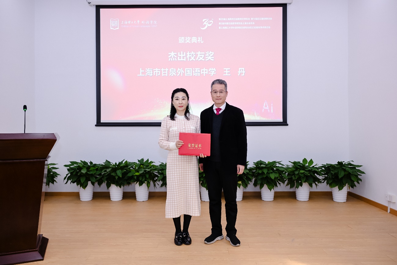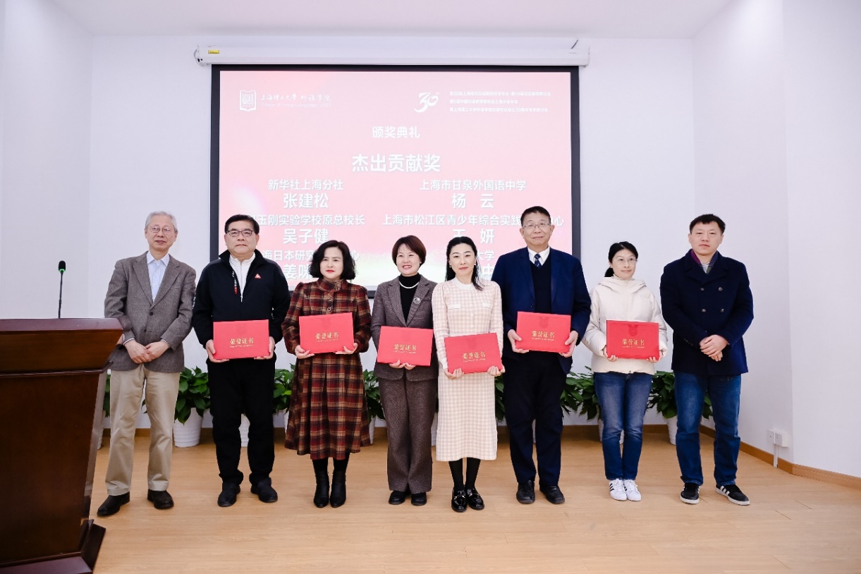 上海市教育委员会国际交流处原副处长张进、上海市人民对外友好协会日本处原处长张雪娜为上海市甘泉外国语中学校长杨云、包玉刚实验学校原总校长吴子健、上海市松江区青少年综合实践教育中心副主任王妍、新华社高级记者张建松、上海日本研究交流中心负责人姜咪红、上海市日本学会副会长马利中颁发“杰出贡献奖”。上海市教育工会干部吴波、外语学院副院长韩戈玲为日语系荣休教师张继彤、张莲群、张文碧、徐彭阳颁发“杰出育才奖”。外语学院党委副书记金小东为beat365官网日语系第一届本科生、上海市甘泉外国语中学副校长王丹颁发“杰出校友奖”。