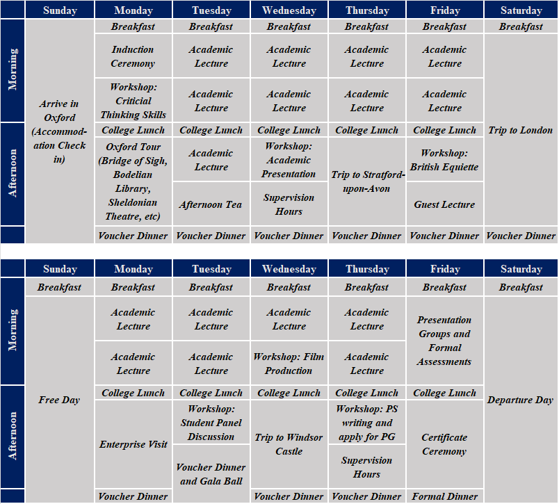 课程由:1. 跨学科学术课程; 2. 学术实践工作坊; 3. 行业特邀嘉宾讲座; 4. 英国企业参访; 5. 英式社交拓展; 6. 英伦文化体验;等六部分组成。