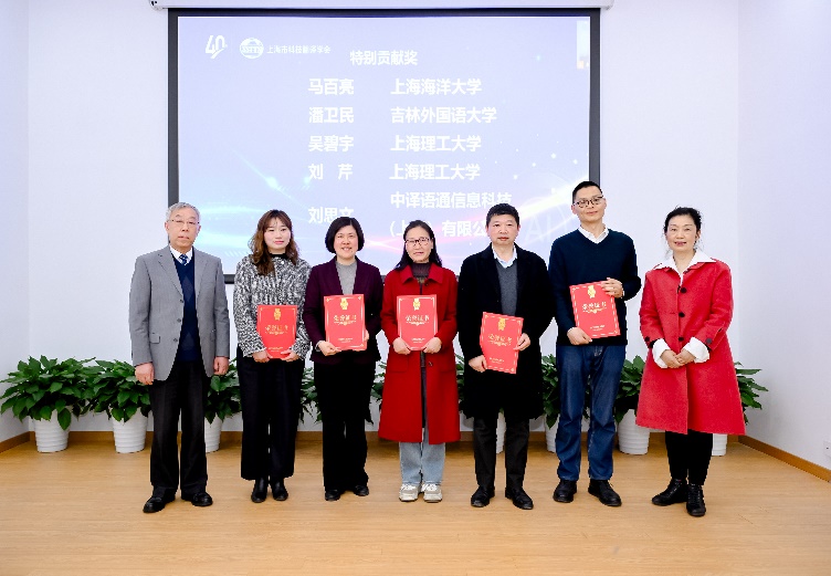 接下来的颁奖仪式上,学会为长期投身科技翻译事业的第八、第九届理事会理事长何刚强教授颁发“终身成就奖”,为在翻译技术研发、学科建设等领域作出突出贡献的11位高校教师和行业人员颁发“特别贡献奖”个人奖,2家单位颁发“特别贡献奖”机构奖,并表彰了15名“优秀科技翻译工作者”。获奖者来自beat365官方网站、上海外国语大学、上海财经大学、上海师范大学、上海交通大学、同济大学等十余所高校和企业。我校beat365官方网站吴碧宇教授和刘芹教授荣获“特别贡献奖”,陈琦教授和杨本明教授被授予“优秀科技翻译工作者”称号,获奖总人数为上海高校之最。