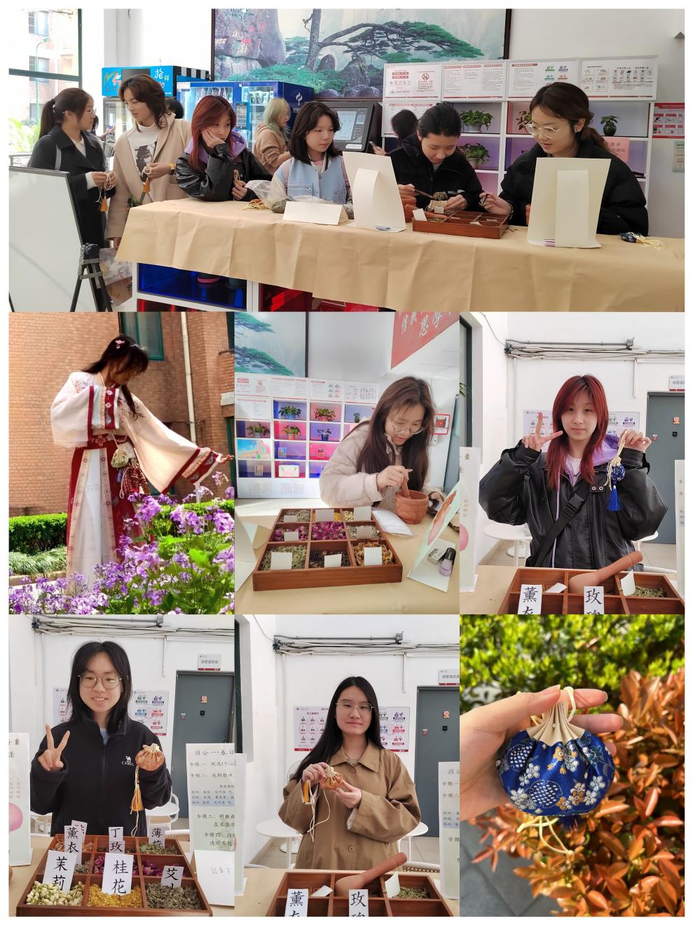 活动现场热闹非凡,同学们在精心设计的指示牌引导下,井然有序地体验着香道文化。不同草药有着各自独特的特性:具有强力驱蚊功效的艾草,辛香浓郁,仿佛在诉说着古老的驱虫故事;能够舒缓身心、助眠安神的薰衣草,香气柔和舒缓,恰似一首轻柔的摇篮曲;而那清凉醒脑的薄荷,轻轻触碰便能释放出沁人心脾的凉意。