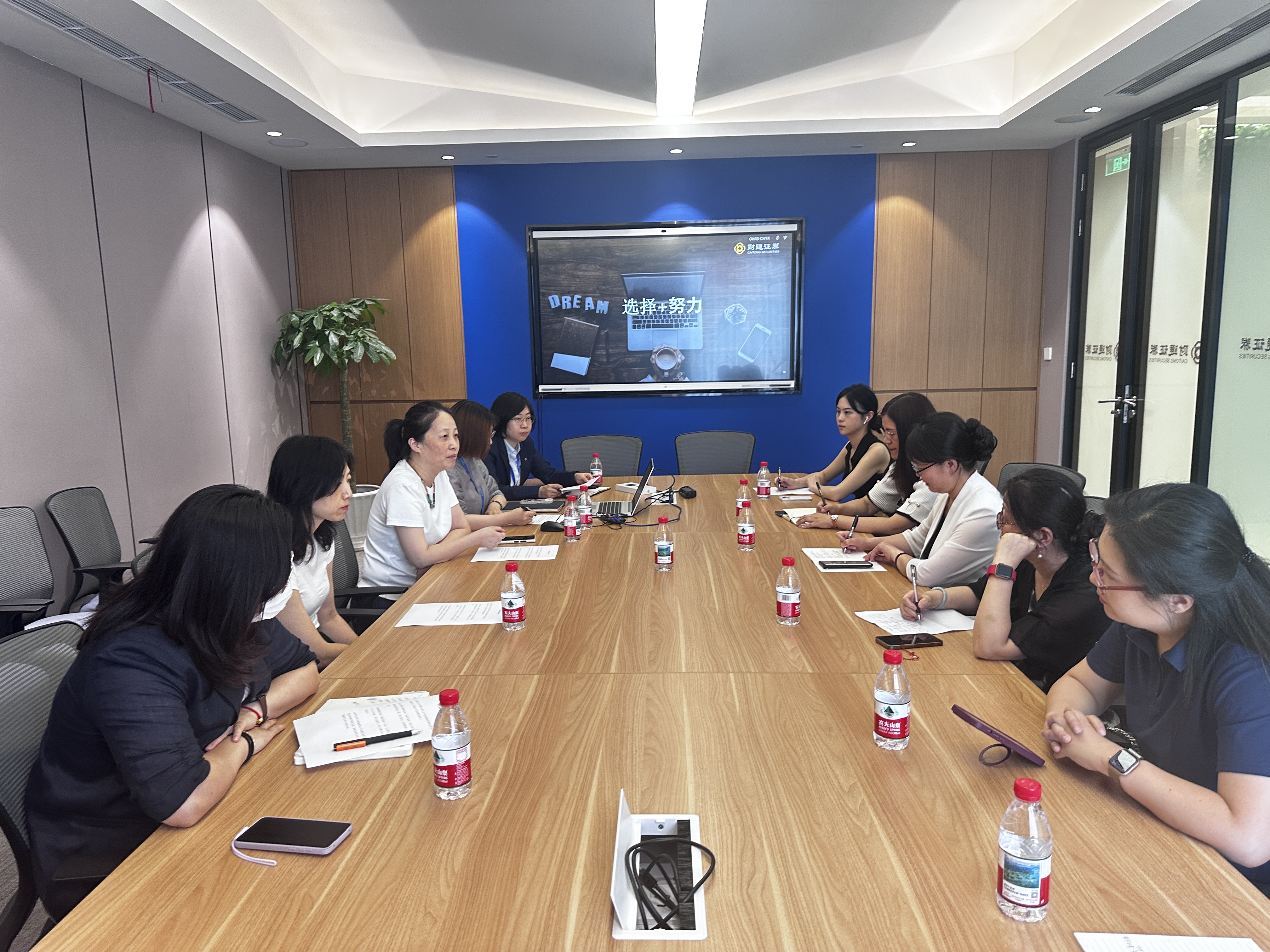 调研团队首先来到财通证券,受到公司相关负责人的热情接待。在交流会上,双方围绕人才培养、课程设置、社会实践、实习拓展、校企合作以及专家讲座等多方面展开深入探讨。财通证券负责人详细介绍了公司在金融领域的业务布局以及对专业人才的需求特点。他们表示,随着金融市场的不断发展,对具备扎实专业知识、良好沟通能力和跨文化素养的复合型人才需求日益增长。英语系负责人则介绍了专业特色与课程体系,强调了中美合作办学模式下学生在语言能力、国际视野和跨文化交流能力方面的优势。双方就如何进一步优化课程设置以满足企业需求、拓展学生实习实践机会以及定期开展专家讲座等议题达成初步共识,为后续深度合作奠定了坚实基础。