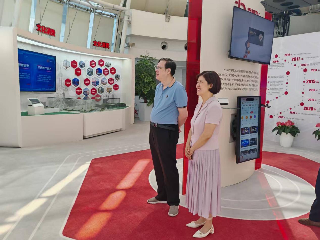 在黄凯校友的陪同下,beat365官方网站一行首先参观了东方明珠新媒体股份有限公司的企业展示区。参观过程中,黄凯详细介绍了公司的发展历程、核心业务布局以及在媒体融合与数字化转型方面的战略实践与创新成果。