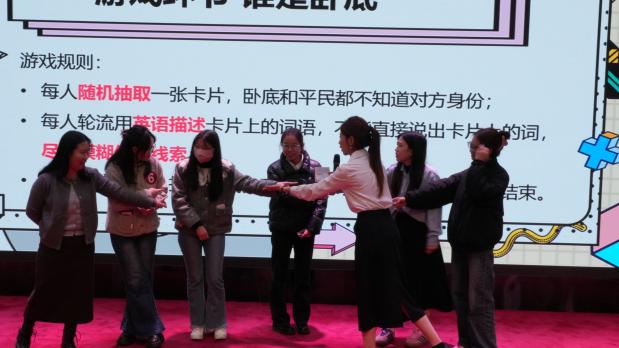 比赛还设有“单词分类赛”与英文版“谁是卧底”互动环节,观众踊跃参与,现场气氛热烈。