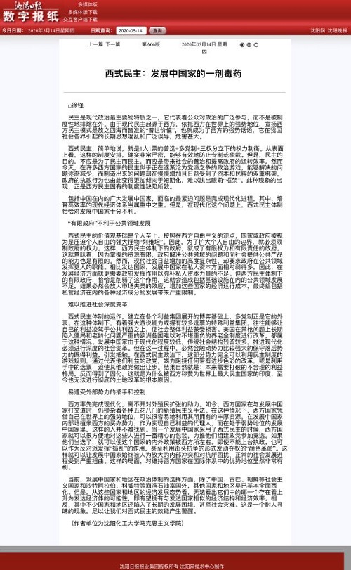 5月14日,我校bw必威西汉姆联官方网站特色理论教研室主任徐锋副教授在《沈阳日报》理论版发表题为《西式民主:发展中国家的一剂毒药》的理论文章。文章针对宣扬西式民主的错误社会思潮,鲜明指出西式民主体制对包括中国在内的广大发展中国家而言有害无利。徐锋副教授从西式民主的“有限政府”不利于公共领域发展、难以推进社会深度变革、西式民主使发展中国家更易遭受外部势力的插手和控制三个方面论述了西式民主对发展中国家的不利因素。文章指出,从已经西化的发展中国家和地区的经济发展态势看,均不存在上升为发达经济体的可能性,相反,其中不少国家和地区还陷入了长期的发展困境,甚至社会灾难。这是一个耐人寻味的现象,足以让我们对西式民主的效能产生警醒。