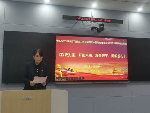 鲍丽明老师领读领学了《以史为鉴、开创未来,埋头苦干、勇毅前行》一文,她提出,本文是习近平总书记在党的十九届六中全会第二次全体会议上的重要讲话,是一篇充满马克思主义真理力量的重要文献。讲话充分彰显了习近平总书记坚定如山的历史自信、居安思危的历史清醒、强烈进取的历史主动精神,为深入学习宣传贯彻全会精神提供了根本遵循。